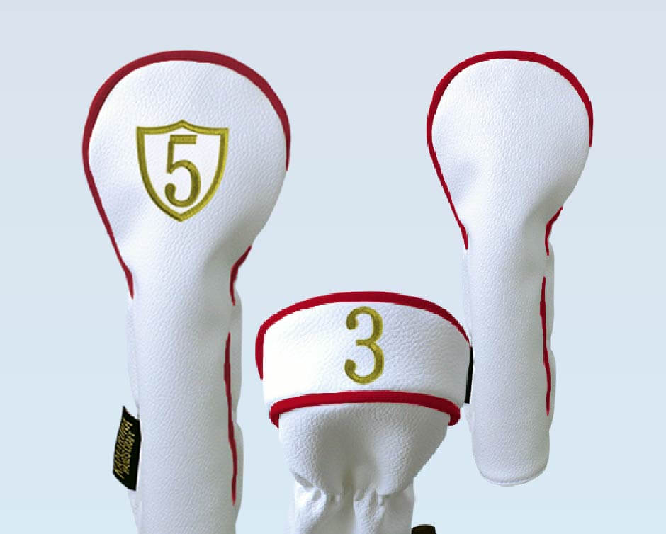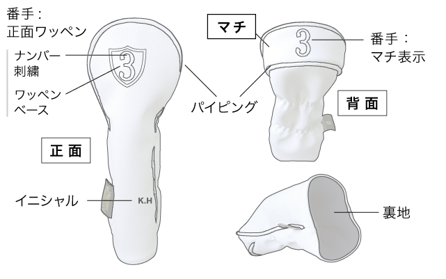 大きく番手がデザインされている正面ワッペンタイプ、カバー上部のマチ部分に番手をデザインしたマチ表示タイプ。どちらも視認性の良い仕上がりとなっています。また番手表示無しの無地タイプもお選びいただけます。