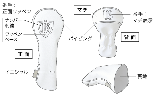 大きく番手がデザインされている正面ワッペンタイプ、カバー上部のマチ部分に番手をデザインしたマチ表示タイプ。どちらも視認性の良い仕上がりとなっています。また番手表示無しの無地タイプもお選びいただけます。